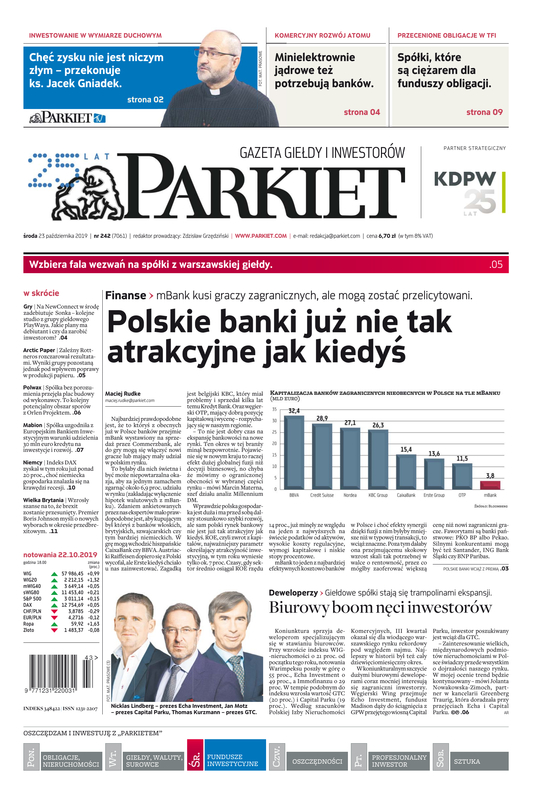 Największy w Polsce newsroom gospodarczy zbiera, analizuje i zgłębia dla Państwa najważniejsze informacje ze świata finansów. Codzienne wydanie „Parkietu”, sześć dni w tygodniu, to kilkadziesiąt artykułów o emitentach, instytucjach finansowych, gospodarce. To również opinie, felietony i wywiady z najważniejszymi ludźmi krajowej i globalnej finansjery.