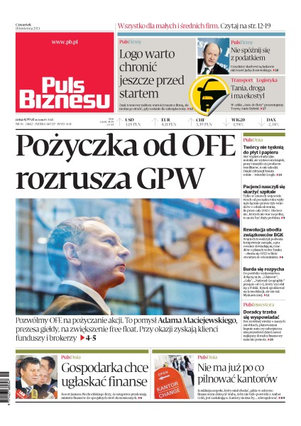 Znak towarowy nabiera wartości razem z firmą, ale można go stracić, gdy zostanie źle zabezpieczony; pozwólmy OFE na pożyczanie akcji – to pomysł Adama Maciejewskiego, prezesa giełdy, na zwiększenie free float; sieć wypiera tradycyjne nośniki, ale wydawcom książek, prasy i muzyki czy producentom filmów, to nie szkodzi; pacjenci nauczyli się skarżyć szpitale; Wojciech Kowalczyk podważa kompetencje zarządu, a pracownicy dowiadują się z mediów o planach wobec banku; Burda się rozpycha – do portfolio wydawnictwa dołączą m.in. „Glamour”, „Gala”, „National Geographic” przejęte od G+J, który wycofał się z Polski; resort Janusza Piechocińskiego liczy, że ustępstwa przekonają ministra finansów do specjalnych stref ekonomicznych.
