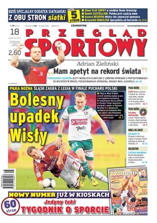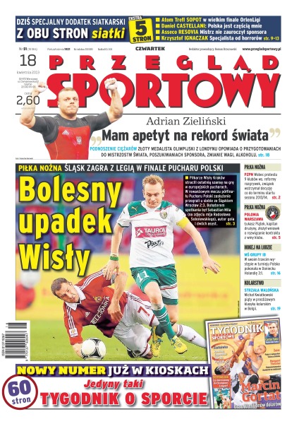 Wrocławianie zagrają w finale Pucharu Polski – w dwumeczu z Białą Gwiazdą okazali się wyraźnie lepsi; Wladimer Dwaliszwili wyrasta na numer jeden w ataku lidera ekstraklasy – wiosną jest najskuteczniejszym napastnikiem drużyny; Atom Trefl Sopot pokonał Bank BPS Muszyna 3:1 i w finale zagra z Tauronem; w MŚ grupy IB biało-czerwoni pokonali w środę Holendrów 3:1; Mistrzowie Polski z Kielc awansowali do półfinału PGNiG Superligi; Maciej Janowski, żużlowiec Unii Tarnów, mistrz świata juniorów z 2011 roku, zaczyna pierwszy sezon jako senior.