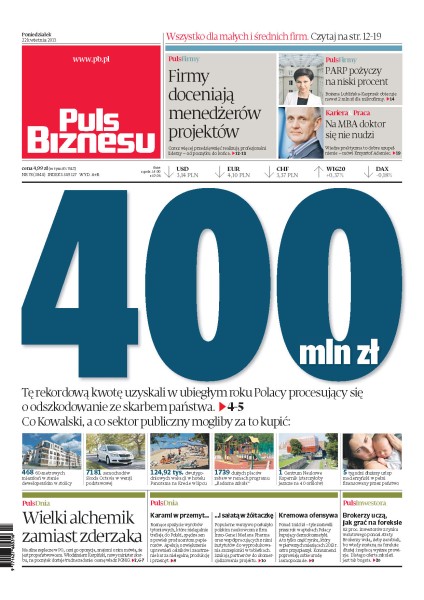 W ubiegłym roku Polacy uzyskali 400 mln zł, procesując się o odszkodowanie ze skarbem państwa; czy ubezpieczenia inwestycyjne są zgodne z prawem – to pytanie coraz głośniej stawia rzecznik ubezpieczonych; koncerny produkujące papierosy sugerują rozszerzenie uprawnień Służby Celnej – w całej Europie rośnie szara strefa; PARP szykuje dla małych firm nowe wsparcie – fundusz pożyczkowy, który ma pomóc we wczesnej fazie rozwoju innowacji.