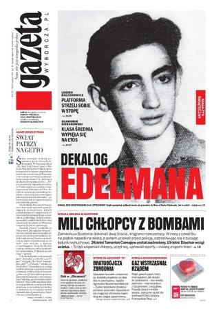 Zamachu w Bostonie dokonali dwaj bracia, imigranci czeczeńscy – w nocy z czwartku na piątek napadli na sklep, a potem uciekali przed policją, ostrzeliwując się i rzucając ładunki wybuchowe; choć na uroczystość 70. rocznicy wybuchu powstania w getcie przybyli prezydent, premier, przewodniczący Parlamentu Europejskiego i merowie stolic Europy, to prawdziwym i największym bohaterem był Symcha Ratajzer-Rotem „Kazik”, jeden z trojga żyjących jeszcze powstańców 1943 r; Stanisław Kociołek został uniewinniony z krwawego stłumienia robotniczych protestów na Wybrzeżu w grudniu 1970 r; premier zdymisjonował ministra skarbu Mikołaja Budzanowskiego i mówił o braku zaufania wobec władz PGNiG; w sobotę 20 kwietnia przypada Record Store Day – święto sklepów muzycznych; tak zaciętego finału nie było w PlusLidze od sześciu lat – mistrza Polski wyłoni dopiero piąty mecz, który nie ma zdecydowanego faworyta.