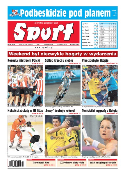 Legia Warszawa pokonała Pogoń Szczecin 3:1; Śląsk Wrocław zremisował z Lechią Gdańsk 1:1; Korona Kielce pokonała Górnik Zabrze 1:0; dzięki świetnej obronie Vive Targi Kielce wygrały pierwsze ćwierćfinałowe starcie z Metalurgiem Skopje i są nieco bliżej Final Four; zawodnicy Asseco Resovii wygrali piąty, decydujący mecz finału PlusLigi z ZAKSĄ w Kędzierzynie-Koźlu i obronili tytuł mistrzów Polski.