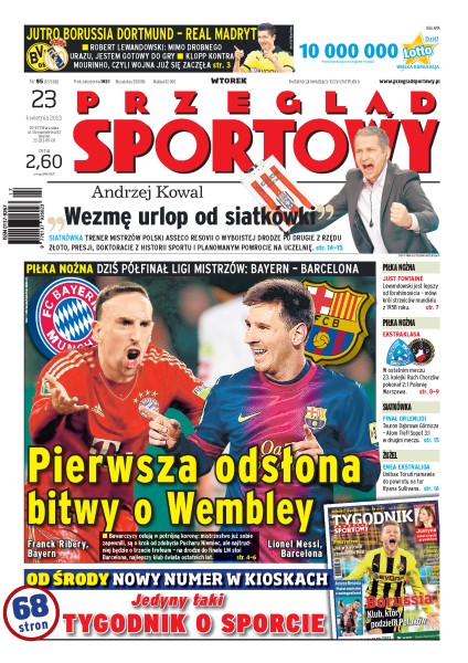 Dziś półfinał Ligi Mistrzów – Bayern zagra z Barceloną, a jutro mecz Borussii Dortmund z Realem Madryt; w ostatnim meczu 23. kolejki Ruch Chorzów pokonał 2:1 Polonię Warszawa; Unibax Toruń namawia do powrotu na tor Ryana Sullivana.