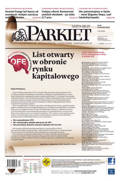 List otwarty w obronie rynku kapitałowego; lepsze od założeń zarządu i biur maklerskich okazały się wyniki Grupy TP w I kwartale tego roku; rozmowa ze Zbigniewem Stopą, prezesem Lubelskiego Węgla Bogdanka; Grupa Kęty mocniej stawia na eksport.