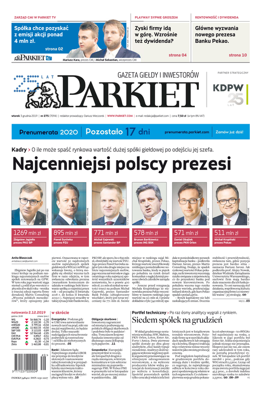 Największy w Polsce newsroom gospodarczy zbiera, analizuje i zgłębia dla Państwa najważniejsze informacje ze świata finansów. Codzienne wydanie „Parkietu”, sześć dni w tygodniu, to kilkadziesiąt artykułów o emitentach, instytucjach finansowych, gospodarce. To również opinie, felietony i wywiady z najważniejszymi ludźmi krajowej i globalnej finansjery.
