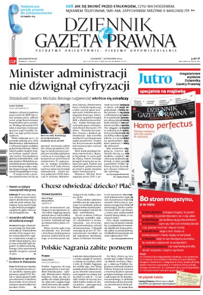 Działalność Ministerstwa Administracji i Cyfryzacji najpewniej wkrótce się zakończy; jak się bronić przed stalkingiem; samorządy szukają recepty na pozbycie się banerów szpecących miasta; rządy Enrica Letty nie będą stabilne – jednak nie musi to wpłynąć źle na odbudowującą się wiarygodność Włoch wobec rynków finansowych; na bazie zasobów Polskich Nagrań i Polskiego Wydawnictwa Muzycznego ma powstać instytucja zajmująca się zarządzaniem dziedzictwem narodowym.