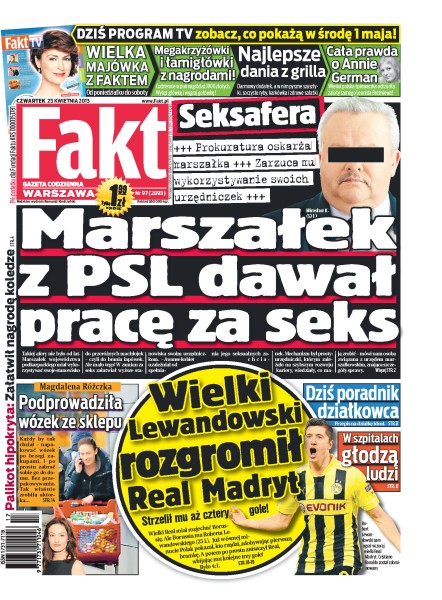 Mirosław K., marszałek z PSL, dawał pracę za seks; Robert Lewandowski strzelił Realowi Madryt cztery gole w półfinałowym meczu Ligi Mistrzów; Magdalena Różczka podprowadziła wózek sklepowy; rozmowa z reżyserem Juliuszem Machulskim.