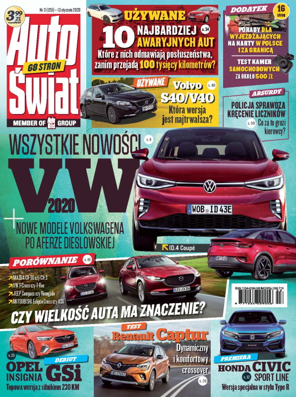 NOWE AUTA: nowości Volkswagena; McLaren Elva; Honda Civic Sport Line; Opel Insignia GSi; aktualności ze świata motoryzacji; TESTY: mniejszy kontra większy – cz. 2; Renault Captur; Audi S6; PORADY: pułapki na piratów drogowych; układy wydechowe; UŻYWANE: top 10 - najgorsze auta w testach na dystansie 100 tys. km; Volvo V40 (2012-19); FASCYNACJE: wersje specjalne Porsche 911; z archiwum „Auto Świata”; youngtimer - Volvo 242 GT (1977-80); STAŁE POZYCJE: absurdy oraz kronika tygodnia; DODATEK - PORADNIK EKSTRA.