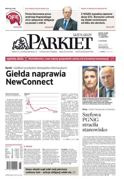 Spółkom przybędzie obowiązków informacyjnych – giełda naprawia NewConnect; Wyżnikiewicz: losy naszej gospodarki zależą od prywatnej konsumpcji; firma kierowana przez Andrzeja Rogowskiego chce uplasować obligacje za ponad 1 mld zł; z WIG20 wypadną zapewne akcje GTC, Boryszew uchroni się dzięki wzmożonym od kilku dni obrotom; szefowa PGNiG straciła stanowisko.