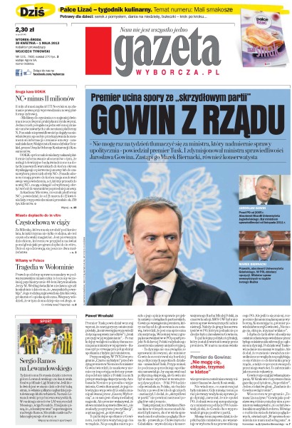 Premier Tusk zdymisjonował ministra sprawiedliwości Jarosława Gowina, zastąpi go Marek Biernacki, również konserwatysta; 11 mln zł musi zapłacić ITI Neovision za złamanie prawa przy wprowadzaniu nowej platformy cyfrowej; Częstochowa w ciąży – miasto dopłaciło do in vitro; tragedia w Wołominie; Sergio Ramos na Lewandowskiego.