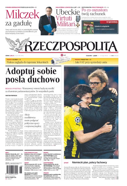 Warszawscy wierni będą się modlić za zbawienie parlamentarzystów – ze wszystkich partii; fiskus zagląda do tajemnic lekarskich; jaki VAT przy sprzedaży auta; podczas ważnych wydarzeń sportowych Polacy wieszają więcej flag niż w trakcie oficjalnych narodowych uroczystości; łowcy mieszkali w prehistorycznym Stonehenge już pięć tysięcy lat przed budową słynnego kamiennego świątynnego kręgu; będziemy nosić w portfelu talię kart płatniczych, jeśli Sejm zaakceptuje zmianę przepisów proponowaną przez Senat.