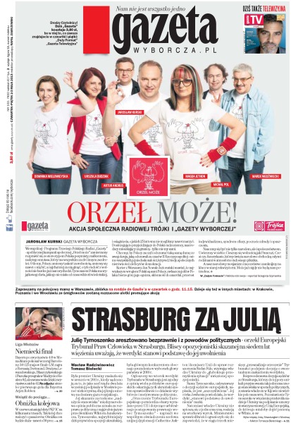 Julię Tymoszenko aresztowano bezprawnie i z powodów politycznych – orzekł Europejski Trybunał Praw Człowieka w Strasburgu; w czerwcu stanieją bilety PKP IC na kilkunastu trasach; Bayern po zwycięstwie 4:0 w Monachium pokonał wczoraj Barcelonę 3:0 i 25 maja w finale LM zagra z Borussią Dortmund; w 240 parkach na świecie setki tysięcy ludzi ścigają się na 5 km – parkrun zaczyna być modny także w Polsce.