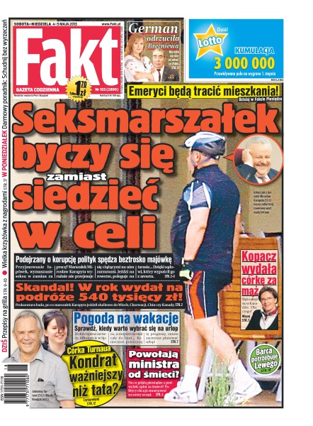 Emeryci będą tracić mieszkania; seksmarszałek byczy się zamiast siedzieć w celi – w rok wydał na podróże 540 tysięcy zł; pogoda na wakacje – sprawdź, kiedy warto wybrać się na urlop; na co pójdą pieniądze z podwyżek opłat za śmieci – politycy chcą je zmarnować na nowy urząd; Barca potrzebuje Lewego.