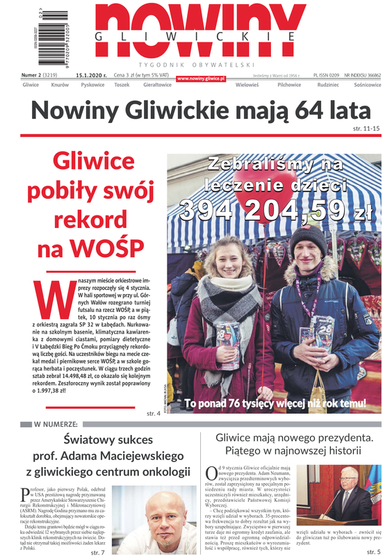 „Nowiny Gliwickie” ukazują się już od 1956 r. Tygodnik obywatelski, który zasięgiem obejmuje Gliwice i powiat gliwicki. Na swoich łamach prezentujemy szeroko pojętą tematykę polityczną, gospodarczą, społeczną, obyczajową, kulturalną, a także sport, ciekawe reportaże i wywiady. Na bieżąco informujemy, co w powiecie piszczy. Jesteśmy organizatorem licznych imprez, takich jak plebiscyt Człowiek Ziemi Gliwickiej czy wybory Miss „Nowin Gliwickich”. Inicjujemy również działalność charytatywną. Opiekujemy się dziećmi ze świetlicy PCK, co roku zapraszamy na wigilię bezdomnych i samotnych. W gazecie nie brakuje okolicznościowych konkursów i zabaw dla czytelników.
