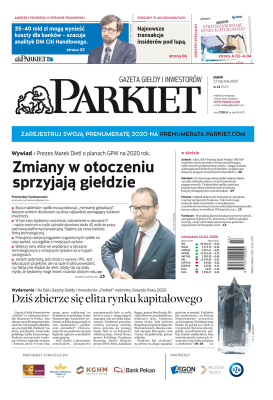 Największy w Polsce newsroom gospodarczy zbiera, analizuje i zgłębia dla Państwa najważniejsze informacje ze świata finansów. Codzienne wydanie „Parkietu”, sześć dni w tygodniu, to kilkadziesiąt artykułów o emitentach, instytucjach finansowych, gospodarce. To również opinie, felietony i wywiady z najważniejszymi ludźmi krajowej i globalnej finansjery.
