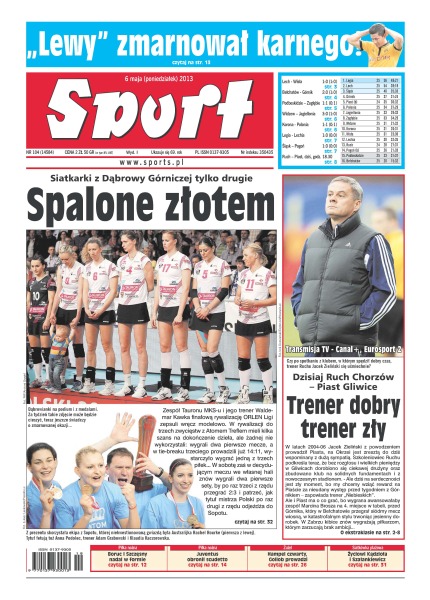 Spalone złotem – siatkarki z Dąbrowy Górniczej tylko drugie; „Lewy” zmarnował karnego; trener dobry, trener zły – dzisiaj mecz Ruch Chorzów - Piast Gliwice; Boruc i Szczęsny nadal w formie; Juventus obronił scudetto; Hampel czwarty, Gollob prowadzi; zabrzański letarg – górnicy przegrali wiosną siódmy raz, tymczasem Bełchatów w dwóch ostatnich meczach wywalczył sześć „oczek” i wraca do gry o pozostanie w lidze; Widzew Łódź – drużyna nie do spadku – takie mecze jak ten z Jagiellonią zdarzają się rzadko, ale widać po nich jakie są potencjalne możliwości drużyny, zwłaszcza gdy od początku wszystko się udaje i nie trzeba nerwowo drżeć o wynik; Hiszpania w odwrocie – eksperyment z transferami z Półwyspu Iberyjskiego przyniósł klubowi wymierne efekty w poprzednim sezonie, w tym formuła zdaje się wyczerpywać; kontuzja Obraniaka – po raz drugi w tym sezonie pomocnik Bordeaux ma problem z kostką.
