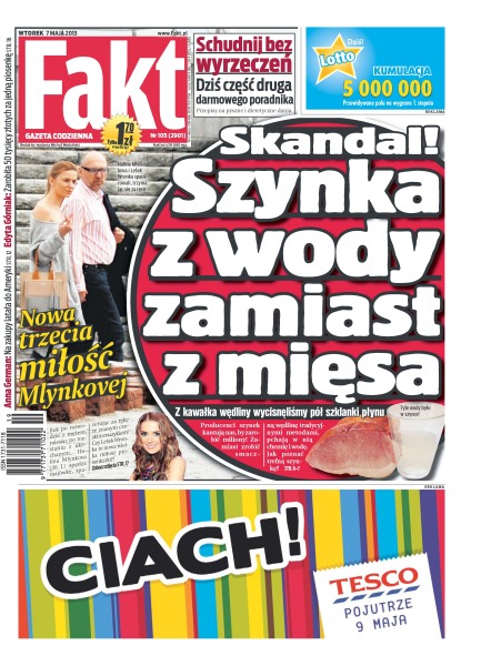 Skandal, szynka z wody zamiast z mięsa – z kawałka wędliny wycisnęliśmy pół szklanki płynu; schudnij bez wyrzeczeń – druga część darmowego poradnika – przepisy na pyszne i dietetyczne dania; nowa, trzecia miłość Haliny Mlynkowej; Anna German – z powodu wysokiego wzrostu na zakupy musiała latać do Ameryki; Edyta Górniak zarobiła 50 tysięcy złotych za jedną piosenkę; zobacz jak będą wyglądać urzędniczki w Sejmie – 200 tysięcy złotych na nowe stroje; wysadził dom, bo nie wzięli go na majówkę; co ukrywa ojciec Madzi – dziś przed sądem stanie Bartłomiej Waśniewski – czy jego zeznania pomogą skazać Katarzynę Waśniewską, czy może znów będzie jej bronił; oto ofiary nieuczciwych prezesów – tylko sześć klubów ekstraklasy nie ma długów wobec piłkarzy.