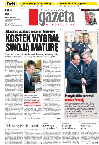 Kostek wygrał swoją maturę – jak pomóc uczniowi z zespołem Aspergera – mama płacze ze szczęścia do słuchawki – Konstanty napisze egzaminy wwydłużonym czasie, to dla niego szansa na samodzielne życie; prezydent Komorowski oswaja Francję – liczący się gracz europejski – a takim chce być Polska – musi grać na kilku fortepianach – dlatego prezydent Bronisław Komorowski poleciał do Paryża na spotkanie z Francois Hollande’em; fiskus przyjemnie dociśnie – wśród przepisów, które mają poprawić sytuację podatników, Ministerstwo Finansów ukryło takie, za sprawą których podatnikom włosy staną dęba; bankomat zamiast kantoru – pod koniec maja będzie można wypłacić banknoty euro z bankomatów należących do sieci Euronet, po kursie porównywalnym z ofertą tanich kantorów.