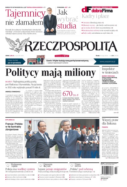 Politycy mają miliony – najbogatszą polską partią jest Platforma Obywatelska – na jej konta w 2012 roku wpłynęło ponad 53 mln zł; inspektor w śmieciach – Polacy masowo deklarują, że od lipca będą segregować odpady, a miasta nie wiedzą, jak sprawdzać, czy to prawda; „Tajemnicy nie złamałem” – burza po wywiadzie Rafała Rogalskiego – rzecznik dyscyplinarny Naczelnej Rady Adwokackiej wnioskuje o wszczęcie postępowania wobec mecenasa; jak wybrać studia – przed wyborem uczelni trzeba ją prześwietlić i sprawdzić, czy po jej ukończeniu jest szansa na pracę; alkomaty w pracy – jak i kiedy z nich korzystać; Francja i Polska – w tle kontrakty zbrojeniowe – prezydent Francji Francois Hollande przyjął wczoraj w Paryżu prezydenta RP Bronisława Komorowskiego w najbardziej uroczysty sposób, jaki dopuszcza francuski protokół dyplomatyczny; lepsze pensje emigrantów – więcej zarabiają, mniej wysyłają do kraju.