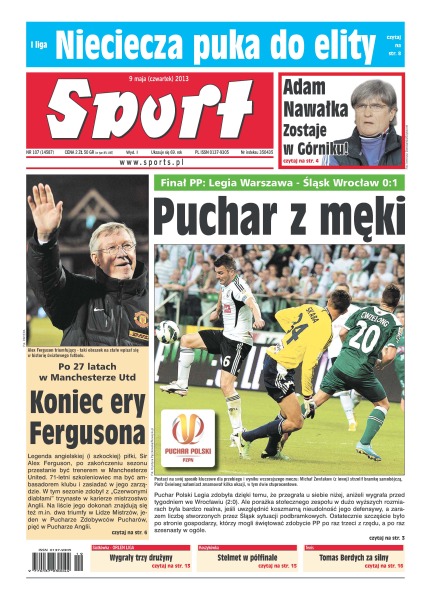Puchar z męki – Puchar Polski Legia zdobyła dzięki temu, że przegrała u siebie niżej, aniżeli wygrała przed tygodniem we Wrocławiu; Adam Nawałka zostaje w Górniku; po 27 latach w Manchesterze United nastąpił koniec ery Fergusona – legenda angielskiej i szkockiej piłki, sir Alex Ferguson, po zakończeniu sezonu przestanie być trenerem w Manchesterze United; jeszcze nie teraz – Jerzy Janowicz przegrał, ale zadbał o dobry mecz, w którym pokazał dojrzały tenis; kwota, która przeraża – Piast Gliwice negocjuje transfery definitywne Damiana Zbozienia i Pawła Oleksego, wypożyczonych odpowiednio z Legii Warszawa i Zagłębia Lubin; lubią gościnę – wiosną na wyjazdach lepszy jest tylko Lech Poznań, a już jutro czeka bielszczan kolejny mecz na boisku rywala.