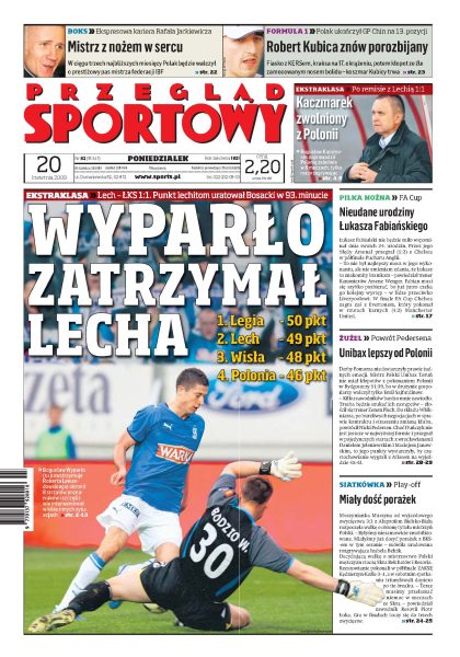 Bogusław Kaczmarek zwolniony z funkcji trenera Polonii; Biała Gwiazda 15 lat czekała na ligowe zwycięstwo w Gdyni nad Arką; Bogusław Wyparła zatrzymał Lecha Poznań; piąte zwycięstwo Górnika Zabrze w tym sezonie; podopieczni trenera Płatka zawiedli po raz kolejny; Łukasz Fabiański podarował wygraną Chelsea, ale i tak latem podpisze nowy kontrakt z Arsenalem; drużyna z Mediolanu ma dziesięć punktów przewagi nad Juventusem, a do końca rozgrywek już tylko sześć kolejek; historia kariery Rafała Jackiewicza; Robert Kubica wreszcie ukończył wyścig, ale dopiero na 13. miejscu; w finale Plusligi obrończynie tytułu mistrzyń Polski z Muszyny wygrały pierwszy, wyjazdowy mecz z Aluprofem 3:2.