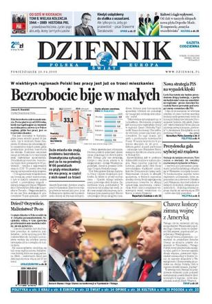 W niektórych regionach Polski bez pracy jest już co trzeci mieszkaniec; SLD ruszył z kampanią do europarlamentu w rytm „Ody do radości” i gorącego latino; szef PiS ma awaryjne wyjście na wypadek wyborczej klęski Lecha Kaczyńskiego; Adam Bielan mówi o projekcie PO na temat zadań prezydenta i premiera na szczytach Unii; niedoświadczony grotołaz utknął na dobę w przejściu między jaskiniami w Górach Sokolich; 24-letni polski kierowca spowodował tragiczny wypadek na brytyjskiej autostradzie niedaleko Luton; co piąte dziecko w Polsce rodzi się w związku pozamałżeńskim; koniec zimnej wojny miedzy Wenezuelą a USA. Dodatki: The Wall Street Journal, Warszawa, Praca.