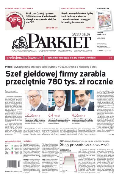 Szef giełdowej firmy zarabia przeciętnie 780 tysięcy złotych rocznie – wynagrodzenia prezesów spółek wzrosły w 2012 r. średnio o niespełna 8 procent; prąd z nowych bloków byłby tani, jednak w starciu z elektrowniami na węgiel brunatny to za mało – kulisy rezygnacji PGE z Opola; profesjonalny inwestor – testujemy narzędzia do gry wbrew trendowi; stopy procentowe znowu w dół – zapowiedzi dalszych cięć nie ma, ale rynek liczy na więcej; Bakalland – litewska NDX twierdzi, że spółka od dawna łamie prawo; TVN – kurs telewizyjnej grupy rósł po tym, jak podała wyniki finansowe za I kwartał – jej przychody spadły i znalazła się pod kreską, ale inwestorzy nagrodzili TVN za ścięcie kosztów; Hygienika – spółka mocno się rozpycha – nie tylko na krajowym rynku; KGHM – zarząd miedziowego kombinatu zarekomenduje wypłatę dywidendy z zysku za 2012 r. w wysokości 1,6 mld zł.