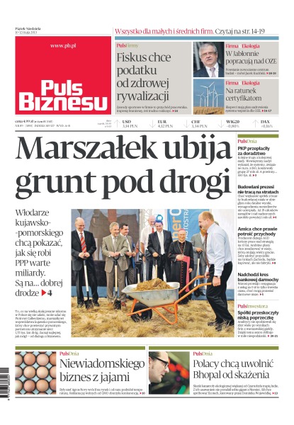 Marszaek ubija grunt pod drogi – włodarze kujawsko-pomorskiego chcą pokazać, jak się robi PPP warte miliardy – są na dobrej drodze; fiskus chce podatku od zdrowej rywalizacji – zawody sportowe w firmie to przychód pracownika – imprezę branżową, też trudno rozliczyć; na ratunek certyfikatom – eksperci mają plan uzdrowienia systemu wsparcia dla OZE; Niewiadomskiego biznes z jajami – były szef Agros-Novy wrócił na rynek i od razu podniósł temperaturę – reklama jaj wolnych od GMO oburzyła konkurencję; Polacy chcą uwolnić Bhopal od skażenia – skutki katastrofy ekologicznej większej od Czarnobyla trapią Indie. Z ich usuwaniem nie poradził sobie gigant z Niemiec – sił chce spróbować Ecotech, kierowany przez Dominika Wojewódkę.