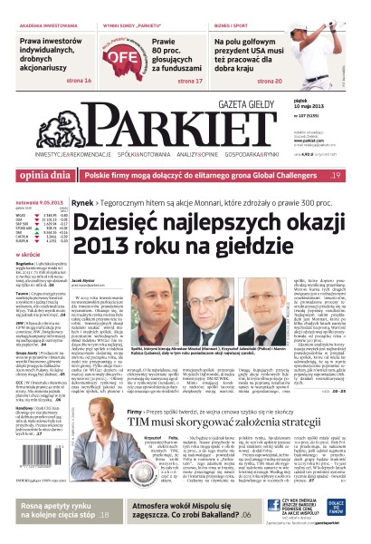 Dziesięć najlepszych okazji 2013 roku na giełdzie – tegorocznym hitem są akcje Monnari, które zdrożały o prawie 300 procent; opinia dnia – polskie firmy mogą dołączyć do elitarnego grona Global Challengers; akademia inwestowania – prawa inwestorów indywidualnych, drobnych akcjonariuszy; na polu golfowym prezydent USA musi też pracować dla dobra kraju; atmosfera wokół Mispolu się zagęszcza – co zrobi Bakalland; TIM musi skorygować założenia strategii – prezes spółki twierdzi, że wojna cenowa szybko się nie skończy; Tauron – grupa energetyczna zamknęła pierwszy kwartał z zyskiem o jedną trzecią wyższym, niż oczekiwali analitycy; JSW – 8 lipca do obrotu na GPW mogą trafić akcje pracownicze JSW; Handlowy – zysk Citi Handlowego po raz pierwszy od debiutu przekroczył 355 mln złotych.