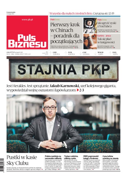 Pierwszy krok w Chinach – poradnik dla początkujących; jak ugryźć zyski z YouTube’a; Jakub Karnowski, szef kolejowego giganta, wypowiedział wojnę oszustom i łapówkarzom; pustki w kasie Sky Clubu – syndyk uprzedza, że wierzyciele biura podróży nie odzyskają pieniędzy; co roku Norwegowie zamierzają wydawać na infrastrukturę transportową 27 mld zł; czy pięciomilionowe straty Narodowego Centrum Sportu z koncertu Madonny to wypadek przy pracy; RWE poprowadzi księgi z Krakowa – niemiecki koncern uruchomi centrum usług, zatrudniając w nim 500 osób; ceny loftów schodzą na ziemię.