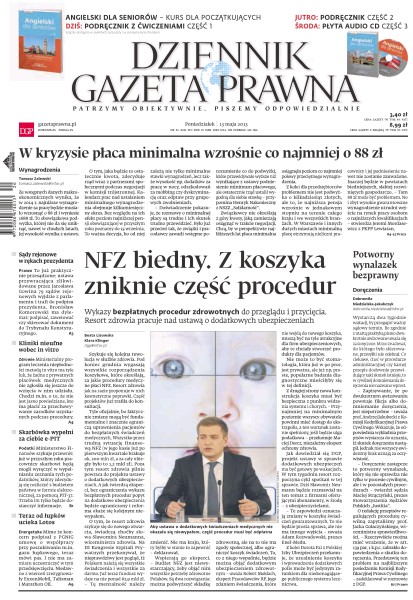 NFZ biedny, z koszyka zniknie część procedur – wykazy bezpłatnych procedur zdrowotnych do przeglądu i przycięcia – resort zdrowia pracuje nad ustawą o dodatkowych ubezpieczeniach; w kryzysie płaca minimalna wzrośnie co najmniej o 88 zł – ze wstępnych danych makroekonomicznych wynika, że w 2014 r. najniższe wynagrodzenie za pracę będzie musiało wzrosnąć o 88 zł i wyniesie 1688 zł; potworny wynalazek bezprawny – wystarczą dwa tygodnie wakacji, by przegapić ważny sądowy termin, bo zgodnie z utartą praktyką pismo dwukrotnie awizowane uważa się za doręczone; sądy rejonowe w rękach prezydenta – to już praktycznie przesądzone: ustawa przywracająca zlikwidowane przez Jarosława Gowina 79 sądów rejonowych wyjdzie z parlamentu i trafi do podpisu prezydenta; skarbówka wypełni za ciebie e-PIT – Ministerstwo Finansów szykuje przewrót: już w przyszłym roku pracownicy skarbowi będą mogli wyręczyć w wypełnianiu zeznania tych podatników, którzy zdecydują się rozliczyć z budżetem państwa w formie elektronicznej, za pomocą PIT-37.