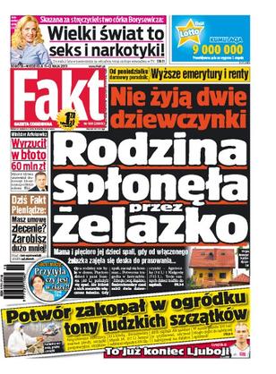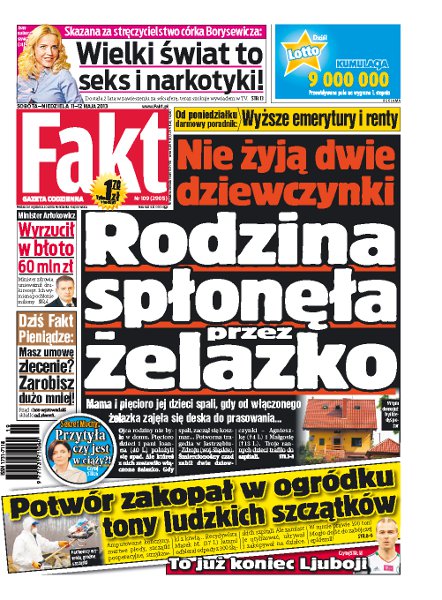 Rodzina spłonęła przez żelazko; córka Borysewicza skazana: wielki świat to seks i narkotyki; minister Arłukowicz wyrzucił w błoto 60 mln zł; potwór zakopał w ogrodzie tony ludzkich szczątków; sekret Muchy: przytyła czy jest w ciąży; to już koniec Ljuboji w warszawskiej Legii; masz umowę zlecenie – zarobisz dużo mniej; ochrona ministra Boniego kosztuje 7 tys. zł dziennie; policja tropi mięsną mafię.