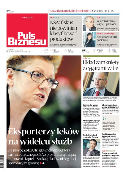 Firmy skarżą się na błędnie stosowaną PKWiU, a klasyfikacja ma wpływ na stawki VAT; na prośbę Zofii Ulz, głównego inspektora farmaceutycznego, CBA z prokuraturą trzepią hurtownie i apteki – szukają śladów nielegalnej sprzedaży za granicę; celnicy pozazdrościli skarbówce, że na kanwie jej postępków powstał głośny film; dzięki dekoderowi HbbTV, łączącemu telewizję z internetem, polski producent elektroniki może trafić do technologicznej pierwszej ligi; austriacka firma ponownie zeszła z placu budowy na A1; polskim sieciom detalicznym, zjednoczonym przeciw zagranicznej konkurencji, razem nie zawsze po drodze; worków na śmieci produkowanych przez firmę z Lubartowa używają nawet Kanadyjczycy; fundusze częściej wychodzą za granicę.