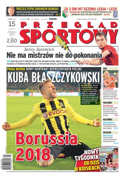 Jakub Błaszczykowski ma przedłużyć dzisiaj kontrakt z Borussią Dortmund – kapitan polskiej kadry podpisze umowę do 2018 roku; Marcin Kamiński wiosną stał się liderem obrony Kolejorza – w meczu z Legią będzie wyjątkowo zmobilizowany; najskuteczniejszy strzelec w historii Chelsea swoją grą przekonuje władze klubu, że warto przedłużyć z nim kontrakt; PSG po 19 latach przerwy sięgnęło po mistrzostwo, ale w Paryżu wielkiej radości nie ma, bo pseudokibice starli się z policją; Rosjanin jako amator wygrał cztery pojedynki z Polakami – czy w piątym, piątkowym starciu w Moskwie złą serię przełamie Andrzej Wawrzyk; 23-letni polski lider grupy Saxo-Tinkoff awansował do czołowej dziesiątki, w której już jest Przemysław Niemiec.