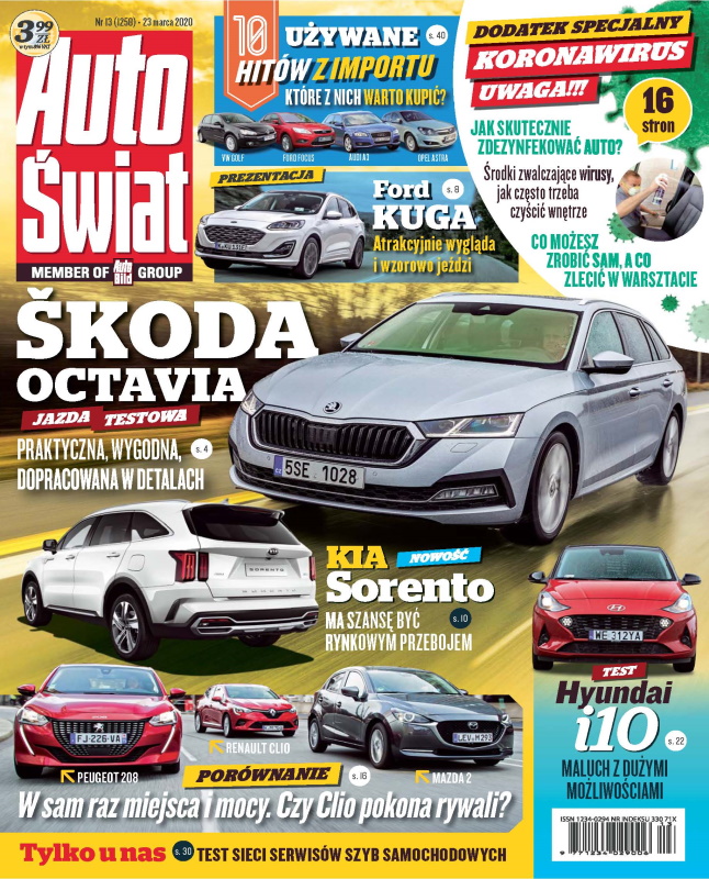 NOWE AUTA: Skoda Octavia Combi; Ford Kuga; Kia Sorento IV; raport - elektryfikacja według Toyoty; TESTY: Mazda 2, Peugeot 208 i Renault Clio; Hyundai i10; Mercedes-AMG CLA 45 S Shooting Brake; DS 3 Crossback E-Tense; PORADY: naprawa szyby w aucie; UŻYWANE: Skoda Kodiaq (od 2016 r.); Top 10 - auta najchętniej sprowadzane z zagranicy; FASCYNACJE: Audi RS Q3 w krainie lodu; FSO Polonez 1500 radiowóz (1978-86); STAŁE POZYCJE: z archiwum „Auto Świata”; absurdy oraz kronika tygodnia; DODATEK: JAK SKUTECZNIE ZDEZYNFEKOWAĆ AUTO.