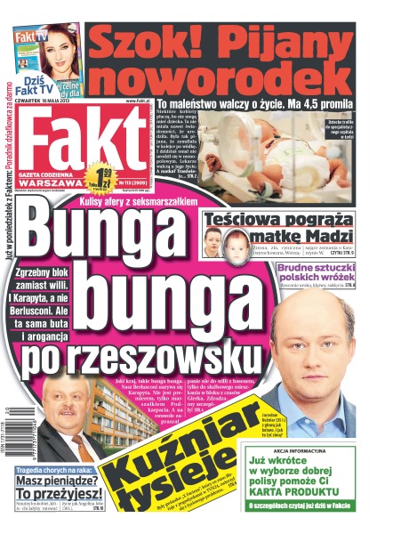 Maleństwo miało 4,5 promila – jego serce ledwie biło, teraz walczy o każdy oddech; w sypialni tajnego służbowego lokum marszałek załatwiał awanse w pracy; wróżka, która rzuca klątwę za 600 zł; mama Bartka pogrąża Waśniewską; 14 Polek umiera dziennie na raka piersi; ochroniarze mordercy dostaną śmieszny wyrok za swoją potworną zbrodnię; Patrycja Pająk już wie, że pokazywanie ciała to najlepszy sposób, by zrobić karierę; prezenterka znalazła następcę Zbigniewa Zamachowskiego; Magda Gessler ma sposób na żołądkowe problemy – do prawie każdej potrawy zamawia alkohol; Komisja Licencyjna PZPN wyrzuca warszawski klub z ekstraklasy – nie mogło być inaczej, skoro jego właściciel nikomu nie płaci pensji; najlepszego piłkarza Legii w rundzie wiosennej nie spotkacie w dyskotece przed końcem sezonu; MIke Tyson okazywał w stolicy miłość swojej trzeciej małżonce.