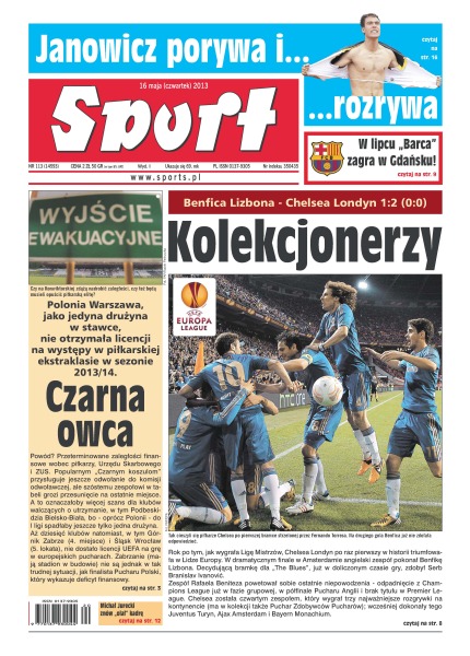 Polonia Warszawa, jako jedyna drużyna w stawce, nie otrzymała licencji na występy w piłkarskiej ekstraklasie w sezonie 2013/14; przyszłość polskiej piłki i szkolenie młodzieży – tak w skrócie można przedstawić istotę wczorajszej debaty; główka Ivanovicia w doliczonym czasie gry zapewniła triumf „The Blues”, którzy podobnie jak przed rokiem w finale Ligi Mistrzów, grali do końca; Robert Lewandowski wczoraj trenował z zespołem BVB – nie wiadomo jednak czy zagra w ostatnim meczu z Hoffenheim; Michał Jurecki po raz drugi odmówił Michaelowi Bieglerowi przyjazdu na zgrupowanie reprezentacji; na zgrupowaniu kadry Andrei Anastasiego w Spale brakuje już tylko Łukasza Żygadły; Aleksander Powietkin mówi, że nie lekceważy Andrzeja Wawrzyka, ale myślami jest przy następnej walce – we wrześniu, z Władimirem Kliczką; w meczu z Jo-Wilfriedem Tsongą Jerzy Janowicz po raz trzeci udowodnił, że potrafi wygrywać z najlepszymi na świecie.