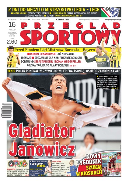 Przed szlagierem ekstraklasy Legia – Lech trudno wyobrazić sobie grę Kolejorza bez Rafała Murawskiego; Polonia Warszawa, jako jedyny zespół w ekstraklasie, nie otrzymała licencji na przyszły sezon, a Śląsk Wrocław nie może grać w europejskich pucharach; Chelsea wygrała 2:1 z Benfiką – The Blues jako pierwsi w historii triumfowali w Lidze Europy rok po tym, jak wygrali Ligę Mistrzów; Jerzy Janowicz odniósł największe w karierze zwycięstwo na kortach ziemnych – w drugiej rundzie na Foro Italico pokonał 6:4, 7:6(5) rozstawionego z numerem 8. Jo-Wilfrieda Tsongę; Robert Kubica szykuje się do kolejnego wyzwania – jutro w roli faworyta rozpocznie rywalizację w imprezie zwanej „rajdem tysiąca zakrętów”.