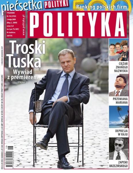 Donald Tusk o kampanii do europarlamentu, kryzysie, trudnych relacjach z prezydentem i opozycją, Januszu Palikocie i Lechu Wałęsie; europejskie walki na narodowe mity; sławne dzieci znanych rodziców; raport: inteligenci 20 lat po PRL - jak się zmieniły ich zawody i warsztat pracy; Pięćsetka Polityki - doroczny ranking krajowych przedsiębiorstw; pierwsza część wcześniej nieujawnianych, osobistych notatek prof. Zbigniewa Brzezińskiego; rozmowa z Martinem Reesem, brytyjskim kosmologiem, mistrzem Trinity College i Astronomem Królewskim; do polityki w Indiach wchodzi kolejne pokolenie rodu Gandhich; powrót Mariana Krzaklewskiego.