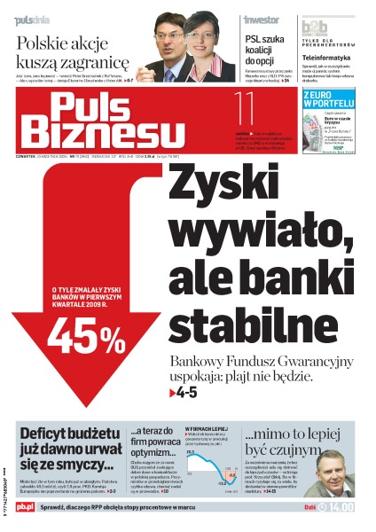 Deficyt sektora finansów publicznych 11 państw UE (w tym Polski) przekracza 3%, w I kwartale bieżącego roku banki zarobiły połowę tego, co przed rokiem, zagraniczne fundusze inwestujące na GPW stawiają na telekomunikację i infrastrukturę, PR stał się obecnie wyjątkowo skuteczny i... tani, indeksy koniunktury gospodarczej szybko rosną, branża chemiczna czeka na obniżkę cen gazu, wzrosty na GPW przed ogłoszeniem wyników spółek są dobrą wróżbą, coraz bliżej do uchwalenia ustawy opcyjnej.