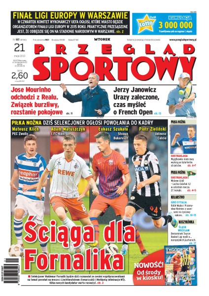 Jose Mourinho odchodzi z Realu Madryt; dziś Waldemar Fornalik, selekcjoner reprezentacji Polski w piłce nożnej, ogłosi powołania do kadry; Widzew Łódź przegrał z Lechią Gdańsk w ostatnim meczu 27. kolejki ekstraklasy.