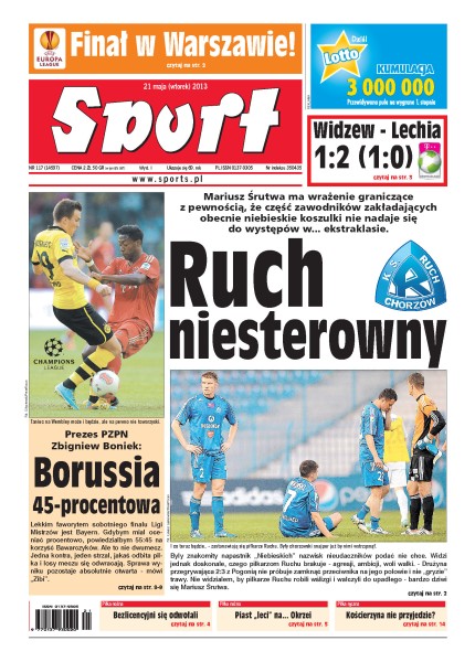 Widzew Łódź przegrał z Lechią Gdańsk w ostatnim meczu 27. kolejki ekstraklasy; według Zbigniewa Bońka lekkim faworytem sobotniego finału Ligi Mistrzów jest Bayern Monachium; rozmowa z Mariuszem Śrutwą, byłym napastnikiem Ruchu Chorzów.