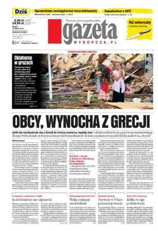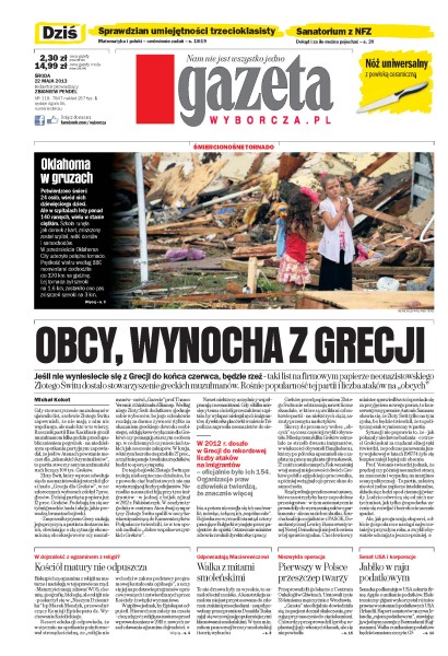 W Grecji rośnie popularność partii neonazistowskiej Złoty Świt oraz liczba ataków na „obcych”; w przedmieścia Oklahoma City uderzyło potężne tornado; kpt. Wiesław Jedynak obalił mit pancernej brzozy smoleńskiej; senacka podkomisja w USA oskarża Apple'a o unikanie podatków; chirurdzy z Centrum Onkologii w Gliwicach przeprowadzili pierwszy w Polsce przeszczep twarzy.