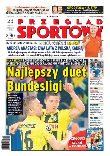 Robert Lewandowski i Jakub Błaszczykowski są najskuteczniejszymi obcokrajowcami w historii Bundesligi; Lech Poznań jest gotowy sprzedać pomocnika Aleksandra Tonewa za 3 mln euro; PZPN zatwierdził reformę rozgrywek; Przemysław Niemiec i Rafał Majka jadą dziś w czasówce Giro d'Italia.