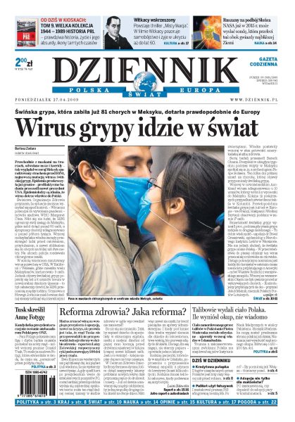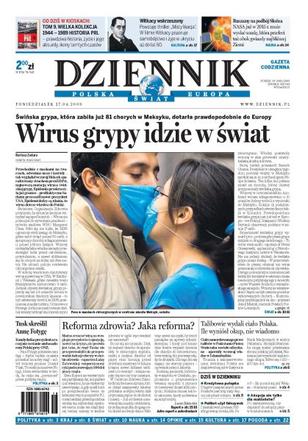 Świńska grypa, która zabiła już 81 chorych w Meksyku, dotarła prawdopodobnie do Europy; premier Tusk zapowiada, że Anna Fotyga nie zostanie przedstawicielem Polski przy ONZ; Palikot wyciąga kwity na szefa PiS, ale nie wie, czy są prawdziwe; nie tylko małżeństwa będą mogły adoptować dzieci; Talibowie wzięli okup i oddali ciało Polaka; zadłużamy się trzy razy szybciej niż przed rokiem; Obama pozostaje ostatnią nadzieją wyborców w USA; kolejny Polak w niewoli u piratów. Dodatki: The Wall Street Journal; Warszawa, Praca.
