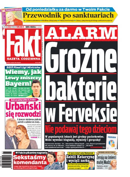 W popularnym leku Fervex znaleziono paciorkowca – może wywołać wymioty, biegunkę i gorączkę; w finale Ligi Mistrzów zagrają dziś Borussia Dortmund i Bayern Monachium; Hubert Urbański się rozwodzi; ciąg dalszy seksafery w opolskiej policji.