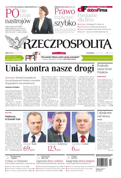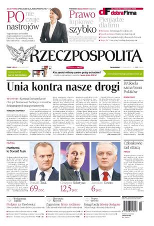Unia kontra nasze drogi – Komisja Europejska nie chce już finansować budowy i remontów dróg gminnych oraz powiatowych; PO nie czuje nastrojów – „Najgroźniejszy jest konflikt światopoglądowy, bo wartością Platformy Obywatelskiej zawsze była centrowość” – Julia Pitera specjalnie dla „Rzeczpospolitej”; prawo łupkowe szybko – premier Donald Tusk zapowiedział, że za kilka tygodni rząd przyjmie projekt zmian do prawa geologicznego i górniczego; Bruksela sama broni Polaków – Londyn chce, by pracownicy z innych krajów UE, m.in. Polacy, mieli mniejsze prawo do korzystania z zasiłków niż Brytyjczycy; Platforma to Donald Tusk – według sondażu Homo Homini dla „Rz” niemal 70 procent wyborców PO chce, aby na czele partii pozostał Tusk; członkowie rad stracą – wynagrodzenia członków rad nadzorczych spółek mają zostać oskładkowane.