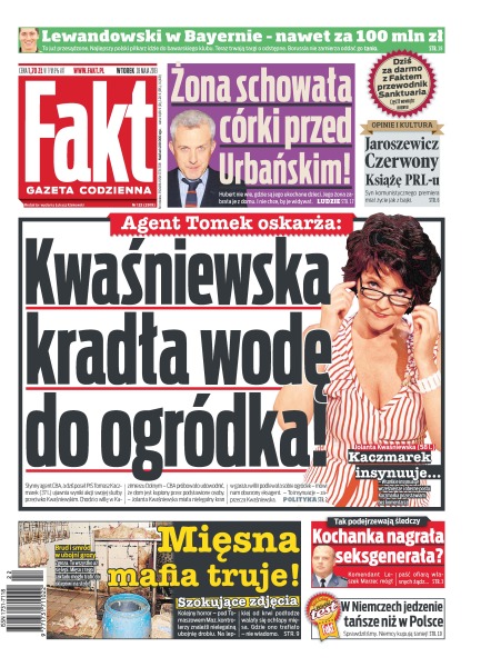 Agent Tomek oskarża: „Kwaśniewska kradła wodę do ogródka” – słynny agent CBA, a dziś poseł PiS Tomasz Kaczmarek ujawnia wyniki akcji swojej służby przeciwko Kwaśniewskim; żona schowała córki przed Urbańskim – Hubert nie wie, gdzie są jego ukochane dzieci – jego żona zabrała je z domu i nie chce, by je widywał; Jaroszewicz, Czerwony Książę PRL-u – syn komunistycznego premiera miał życie jak z bajki; Lewandowski w Bayernie, nawet za 100 mln zł – to już przesądzone, najlepszy polski piłkarz idzie do bawarskiego klubu – teraz trwają targi o odstępne, Borussia nie zamierza oddać go tanio; mięsna mafia truje – kolejny horror – pod Tomaszowem Mazowieckim kontrolerzy znaleźli nielegalną ubojnię drobiu – na lepkiej od krwi podłodze walały się ochłapy mięsa; w Niemczech jedzenie tańsze niż w Polsce; kochanka nagrała seksgenerała – komendant Leszek Marzec mógł paść ofiarą własnych żądz.