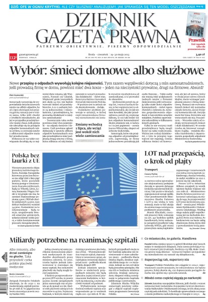 Wybór, śmieci domowe albo służbowe – nowe przepisy o odpadach wywołują kolejne niejasności – tym razem wątpliwości dotyczą 3 mln samozatrudnionych, jeśli prowadzą firmę w domu, powinni mieć dwa kosze – jeden na nieczystości prywatne, drugi na firmowe; Polska bez laurki z UE – Warszawa pozostanie objęta procedurą nadmiernego deficytu – Komisja Europejska kierowana przez Jose Barroso ma zdjąć dziś z listy pięć państw, które poczyniły istotny postęp w równoważeniu finansów publicznych; LOT nad przepaścią, o krok od plajty – 11 czerwca walne zgromadzenie akcjonariuszy podejmie decyzję w sprawie dalszego istnienia narodowej linii lotniczej; miliardy potrzebne na reanimację szpitali – albo remonty, albo drzwi zamknięte na głucho – taka przyszłość czeka polskie placówki medyczne; co miasteczko, to galeria, handlowa – jedno miejsce pracy w galerii likwiduje pięć innych miejsc w mniejszych sklepach.