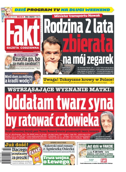 „Oddałam twarz syna by ratować człowieka” – dzięki odważnej decyzji pani Teresy Banach lekarze przeszczepili twarz rannemu; „Rodzina 2 lata zbierała na mój zegarek” – minister transportu Nowak; uwaga, toksyczne krowy w Polsce – dla zysku producenci szprycują krowy groźnymi dla ludzi antybiotykami – a potem my jemy to mięso; żona Urbańskiego rzuciła go, bo za mało zarabiał – gdy zarobki gwiazdora spadły do 30 tysięcy na miesiąc, zaczęło się ponoć źle dziać; Kwaśniewscy mieli dom za miliony, a kradli wodę; dlaczego przepłacamy za proszki, już dość – z niemieckiego proszku wychodzi więcej prań niż z polskiego; Rakowski miał romans z Agnieszką Osiecką – poznaj miłosne sekrety poetki i aparatczyka PRL; trwa wojna o Roberta Lewandowskiego.